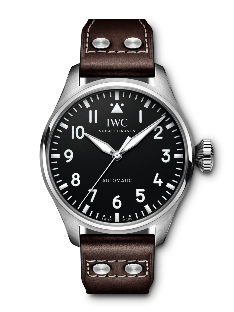 No other model expresses the fascination of IWC Schaffhausen aviator’s watches like the Big Pilot’s Watch. Its purely functional cockpit-instrument design and oversized conical crown were inspired by a military observation watch from the 1940s. The Big Pilot’s Watch 43 is a faithful interpretation of this original design without any additional elements on the dial, and in a 43-millimetre stainless steel case that combines an amazing presence on the wrist with maximum wearing comfort. This model features a black dial, rhodium-plated hands and a brown calfskin strap. Visible through the sapphire glass case back is the IWC-manufactured 82100 calibre. The Pellaton winding system has been reinforced with ceramic components and builds up a power reserve of 60 hours. The practical EasX-CHANGE® system and a choice of straps in calfskin, rubber or stainless steel provide a high degree of flexibility. Combined with the now 10 bar water-resistant case, this transforms the Big Pilot's Watch 43 into a modern, fully versatile sports watch.
