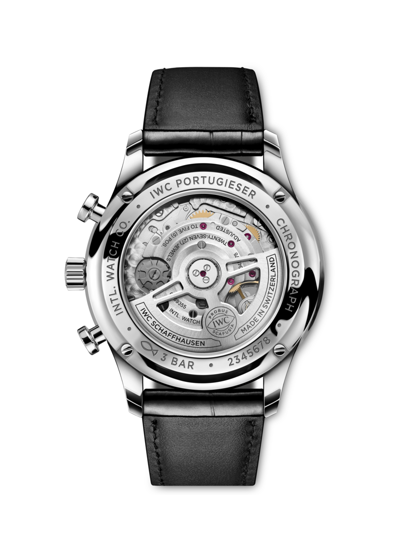 This version features a stainless steel case with a diameter of 41 millimeters, a Dune dial, and gold-plated hands and gold appliques. A particular highlight is the intricately crafted dial, which is manufactured in a complex process comprising 60 individual steps. The unusual optical depth is created by applying 15 layers of transparent lacquer, which is fine-ground and then polished to a high gloss finish. The subdials are milled into both the brass blank and the lacquer layer. A special printing process further enhances the three-dimensional effect. Finally, the appliques are individually mounted on the dial by hand. The Portugieser Chronograph is powered by the IWC-manufactured 69355 caliber, a mechanical chronograph movement engineered with an uncompromising focus on robustness, reliability, and longevity. The watch is fitted with a black alligator leather strap with a stainless steel pin buckle.
