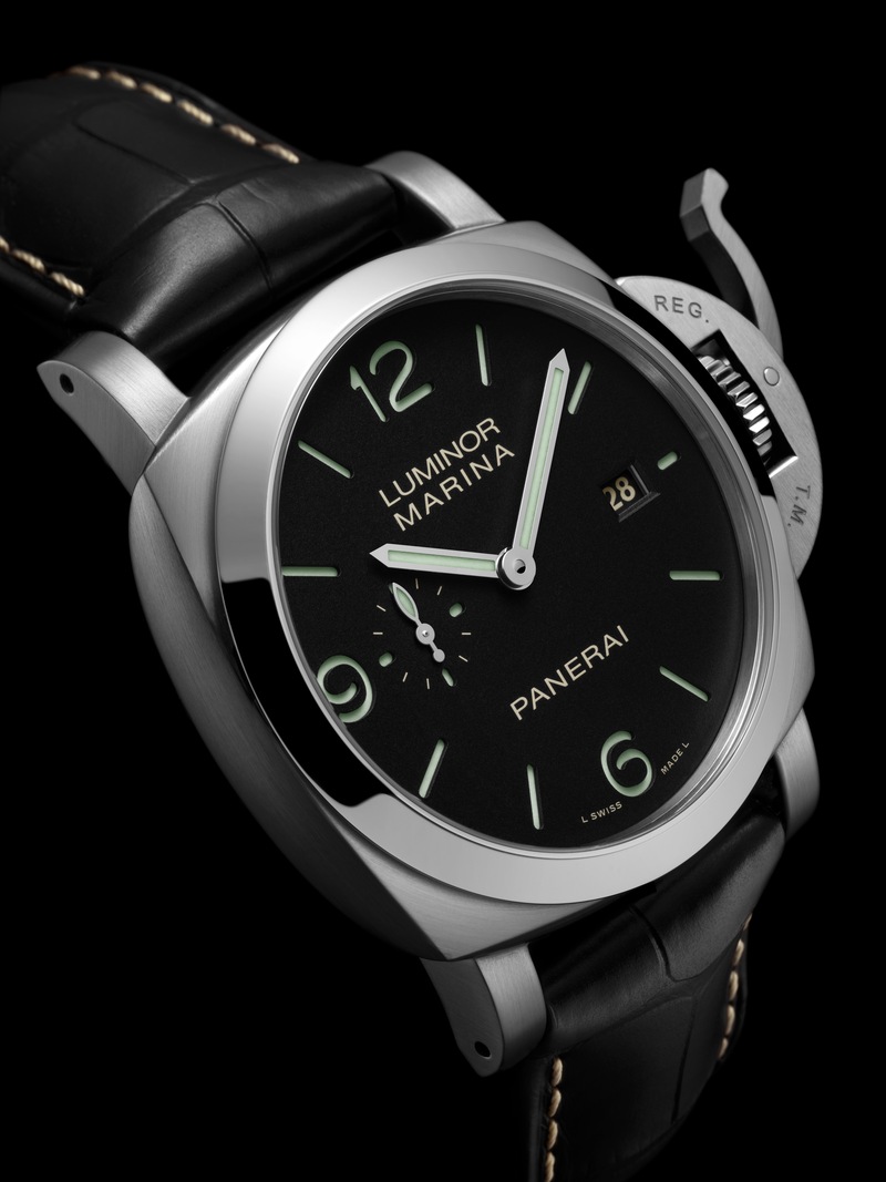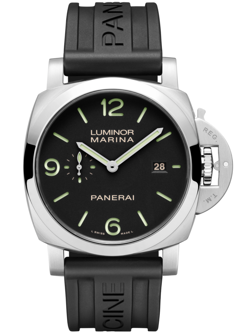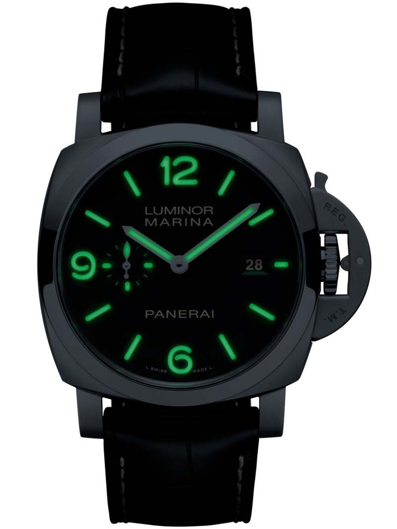 Black with Grade X2 Super-LumiNova® Arabic numerals and hour markers. Date at 3 o'clock and small seconds at 9 o'clock.