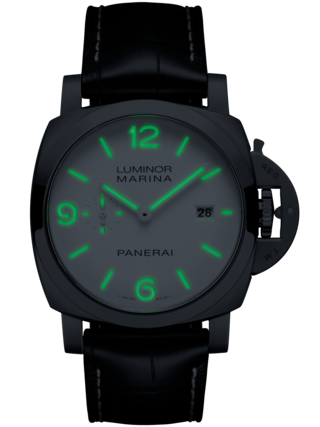 White with Grade X2 Super-LumiNova® Arabic numerals and hour markers. Date at 3 o'clock and small seconds at 9 o'clock