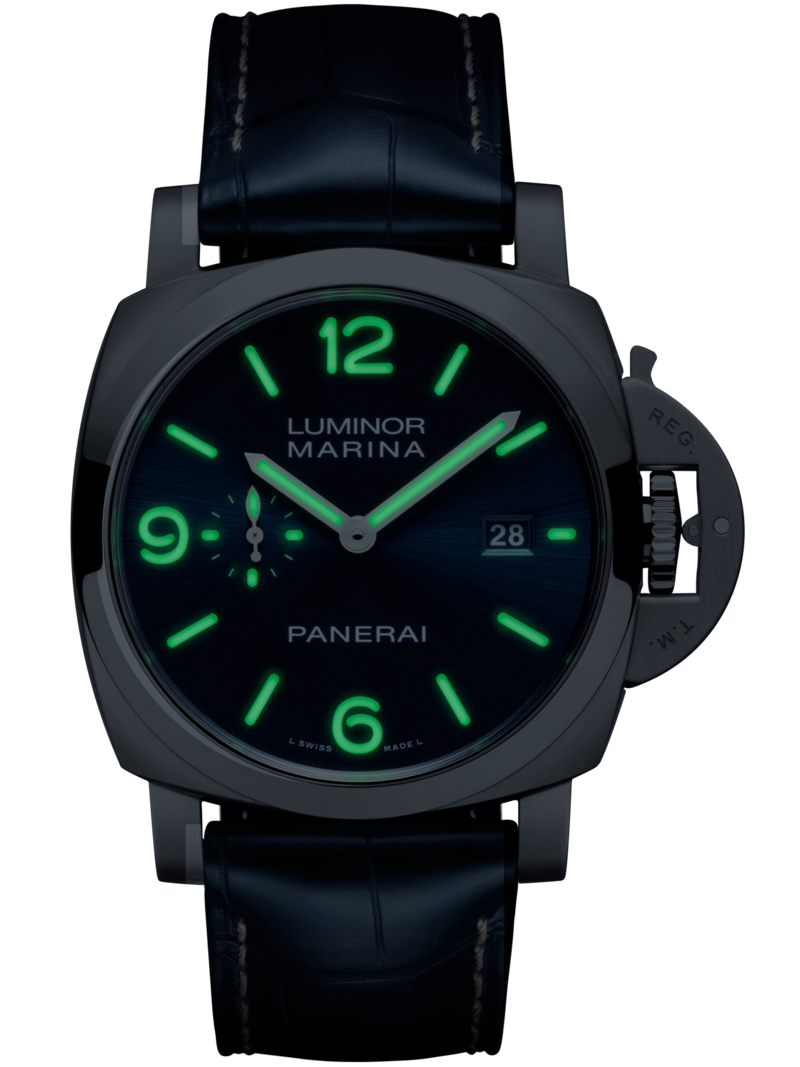 Blue sun-brushed with Grade X2 Super-LumiNova® Arabic numerals and hour markers. Date at 3 o'clock and small seconds at 9 o'clock