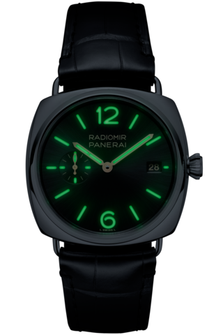 Black sun-brushed with luminous Arabic numerals and hour markers. Date at 3 o'clock and small seconds at 9 o'clock
