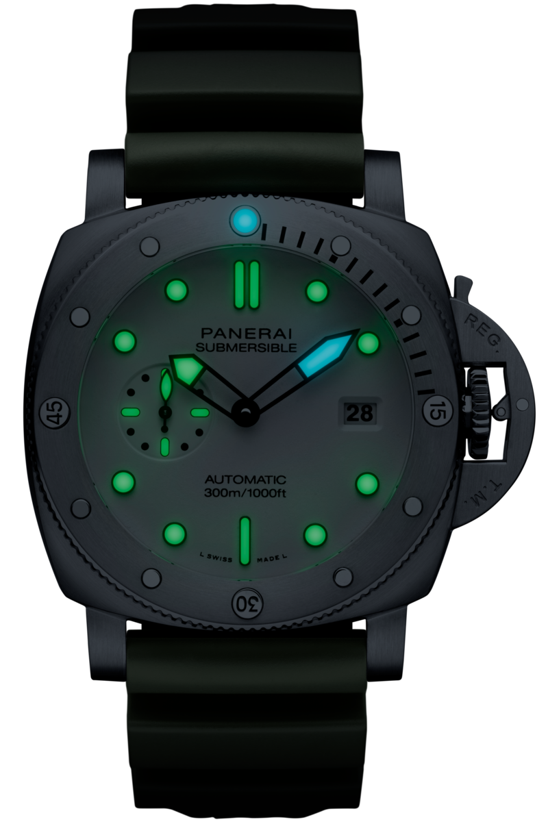 White with luminous hour markers and dots. Date at 3 o'clock, small seconds at 9 o'clock.